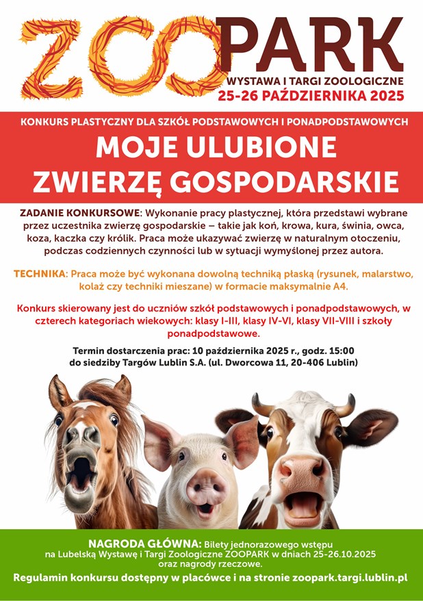 Termin dostarczenia prac do Organizatora upływa 10 października 2025 o godz. 15:00. Ogłoszenie wyników - 16 października o godz. 12:00 na stronie zoopark.targi.lublin.pl oraz na Facebooku.