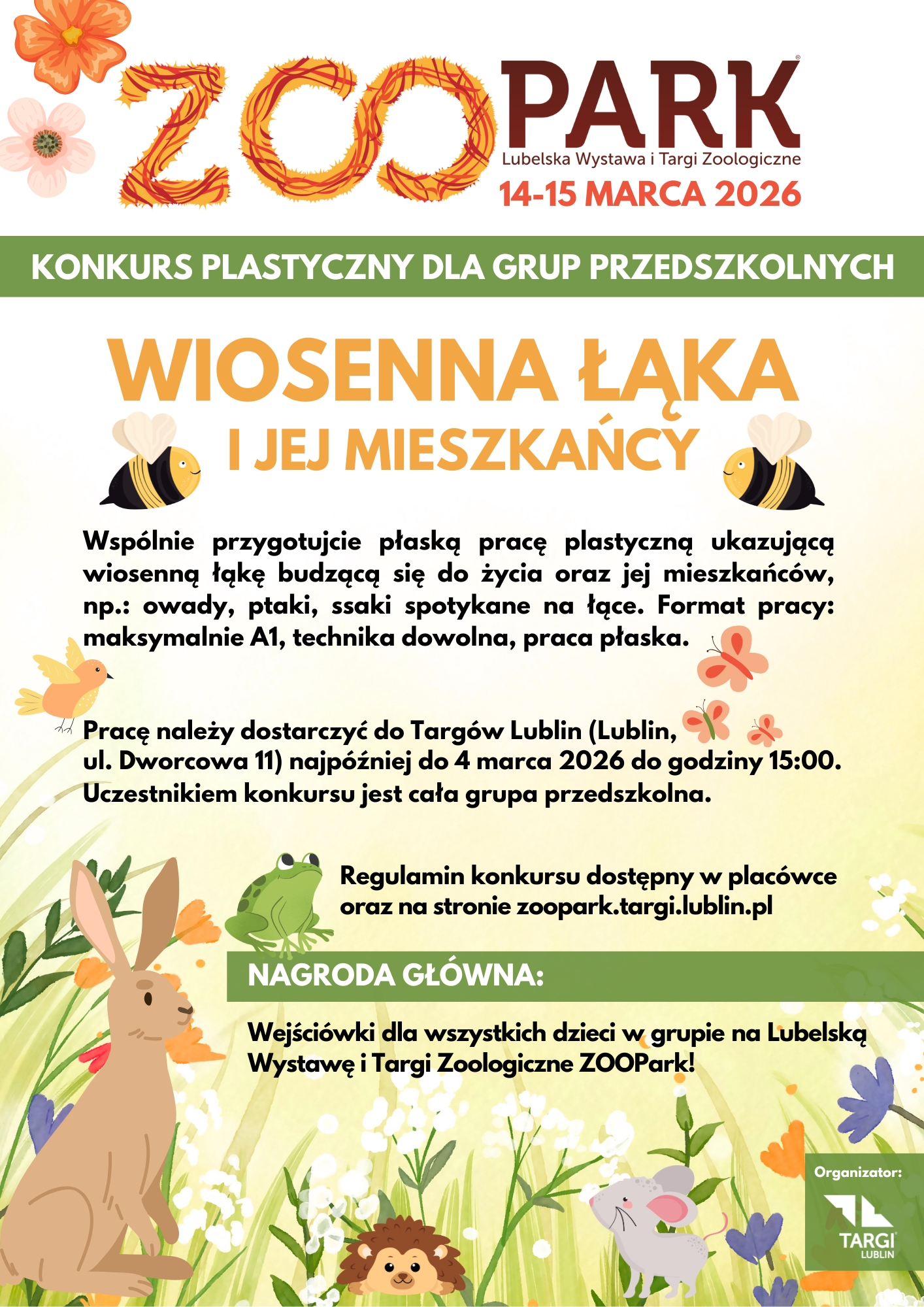 Nagrodą główną w konkursie są bilety jednorazowego wstępu na Lubelską Wystawę i Targi Zoologiczne ZOOPARK dla dzieci z 3 zwycięskich grup. Wydarzenie odbędzie się w w dniach 14-15 marca 2026r. w Targach Lublin (ul. Dworcowa 11). Bilety będzie można wykorzystać 14 lub 15 marca 2026 roku.