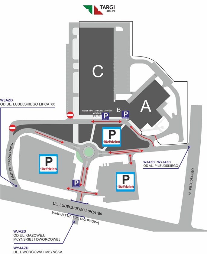 Parking płatny – miejsca parkingowe na terenie Targów Lublin przy ul. Dworcowej, bilety parkingowe w cenie 10 zł - wjazd na tereny płatnych parkingów od ul. Dworcowej i al. Piłsudskiego.