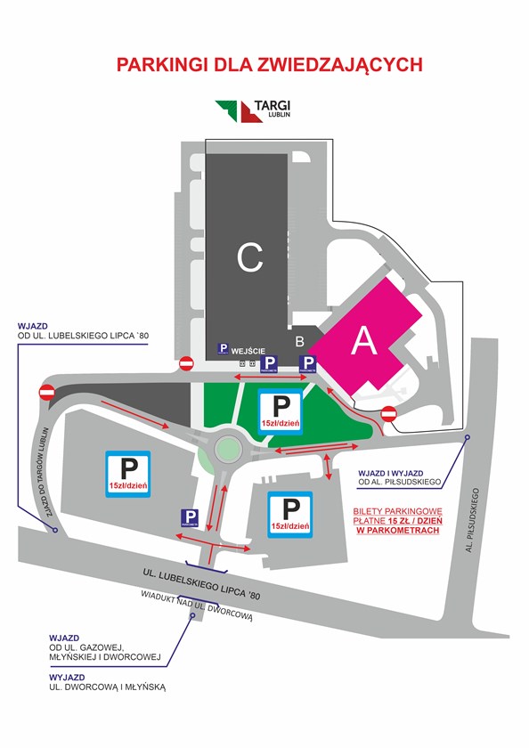 Parking płatny – miejsca parkingowe na terenie Targów Lublin przy ul. Dworcowej, bilety parkingowe w cenie 15 zł - wjazd na tereny płatnych parkingów od ul. Dworcowej i al. Piłsudskiego.